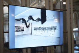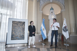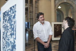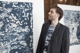 The artwork Pilgrim Notes, displayed here, is a graphic installation that reinterprets places visited by the artist at different moments in time. Through the process of memory and its documentation, these places transitioned from drawings and notes into a work featuring multiple processes and exhibition formats. Presented here are 6 of the 20 wooden plates worked with power tools that make up the complete installation, currently exhibited at the MAR Museum in Mar del Plata, along with 6 prints on fabric in blue tones on the reverse side of each panel. This set of wooden plates, carved on both sides, serves as engraving matrices and is arranged in relation to the circular space that contains them.